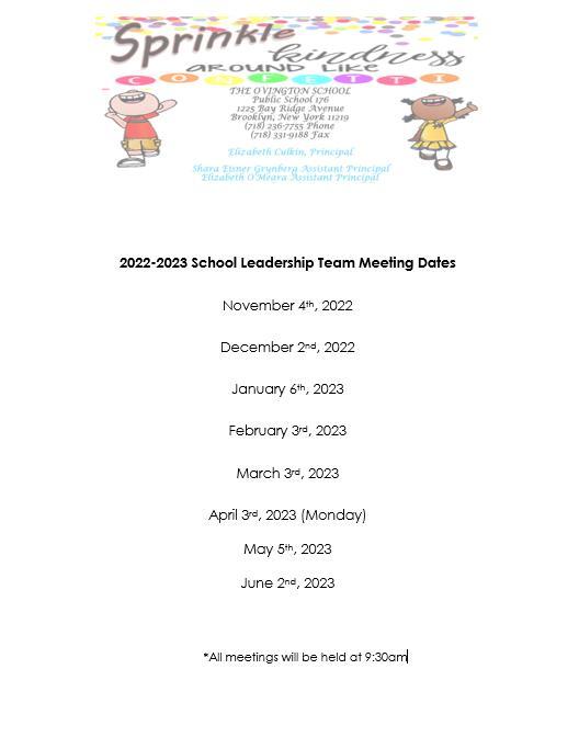 School Leadership Team meetings are held the first Friday of every month at 9:30am. All parents are welcome to observe the meeting.